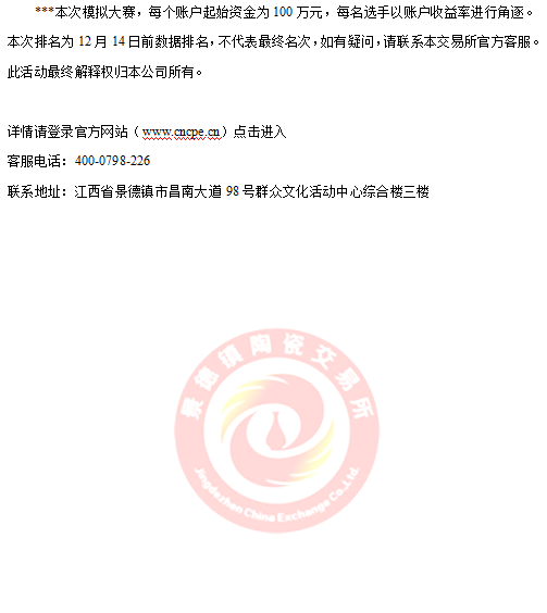景德鎮(zhèn)陶瓷交易所首屆昌南杯模擬交易大賽10月18日火熱開(kāi)賽以來(lái),參賽人數(shù)持續(xù)攀升。通過(guò)近兩個(gè)月模擬交易大賽的鍛煉,參與模擬交易大賽的投資人會(huì)員對(duì)陶瓷藝術(shù)品投資的認(rèn)知度不斷提高,比賽也漸入佳境。截止12月14日收盤(pán),模擬賬號(hào)"8001000001"以總收益率761.04%的成績(jī)拔得頭籌。"8001000002"以總收益451.05%的成績(jī)緊隨其后。"8001000003"以總收益388.04%成績(jī)位列第三。前二十選手的總收益也都在100%以上,值得慶賀。接下來(lái)的賽況如何,我們拭目以待!報(bào)名入口請(qǐng)點(diǎn)擊
