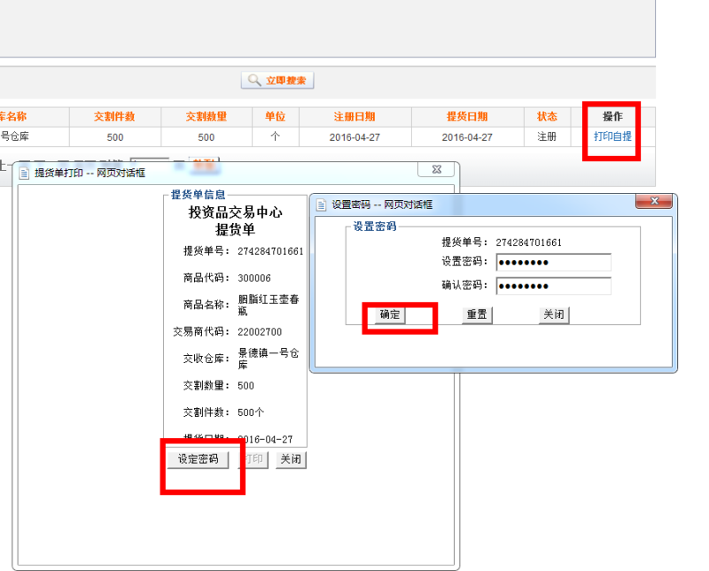 綜合業務---發售業務---交收提貨---自提打印,設定提貨密碼、打印;